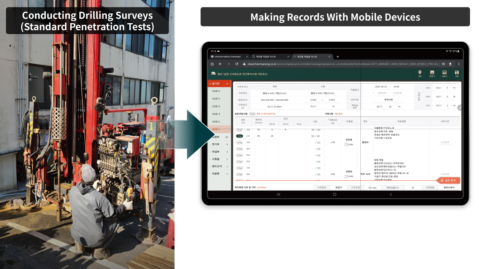 Drilling survey records including detailed stratum information such as drilling location, casing depth, depth survey details, samples and foreground photographs can be prepared and shared in real time with on-site mobile devices (tablets and smartphones).